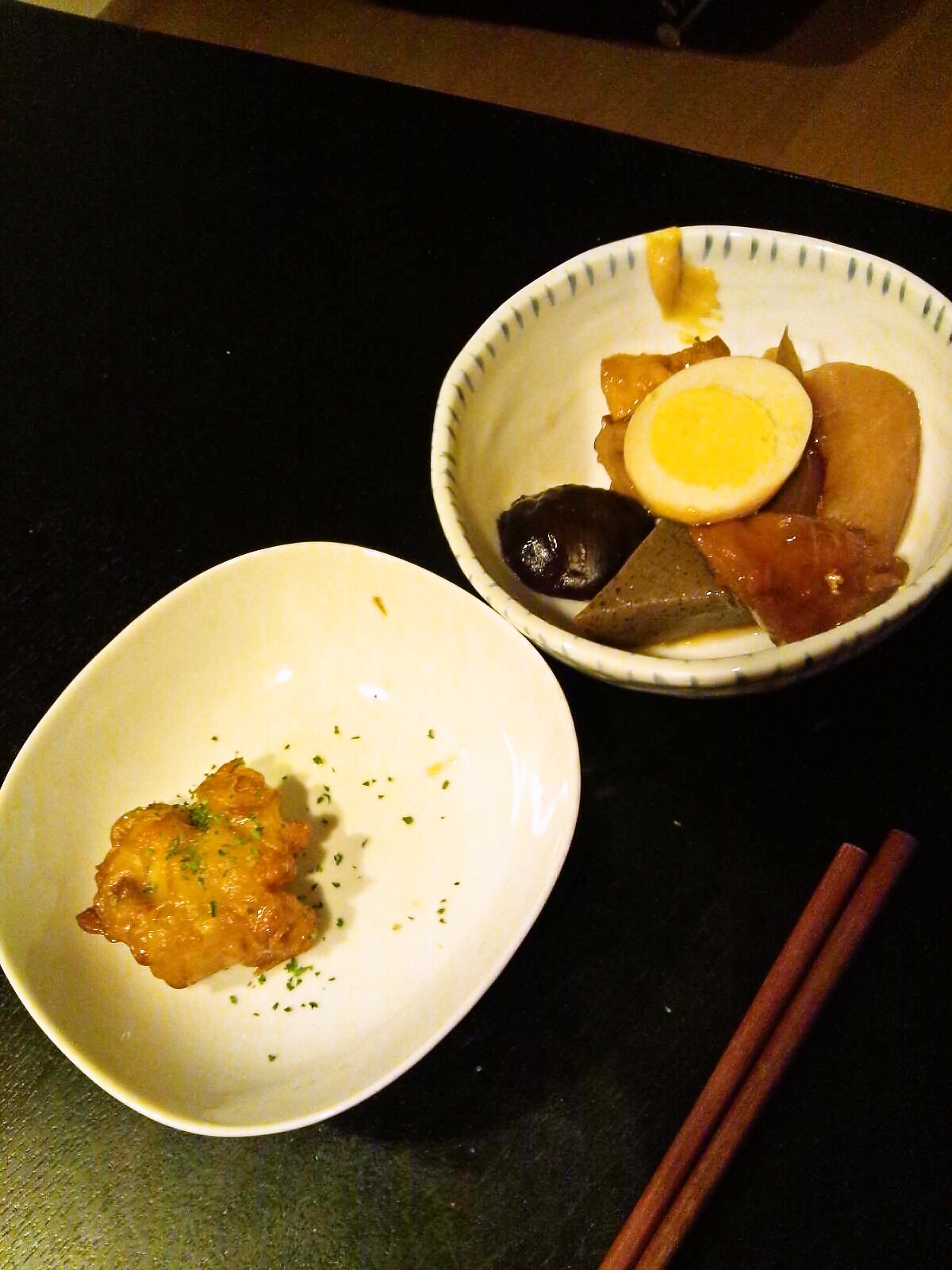 家に帰って2分後、それらを食べました。なお、料理をする人の節度として、ちゃんとお皿に移して盛り付けました。から揚げ棒は串からはずして乾燥パセリをふりかけてみたりして、ややもすれば単なる醜悪な肉塊にも見えてしまいがちなから揚げも、ちょっぴり品よく仕上がって。