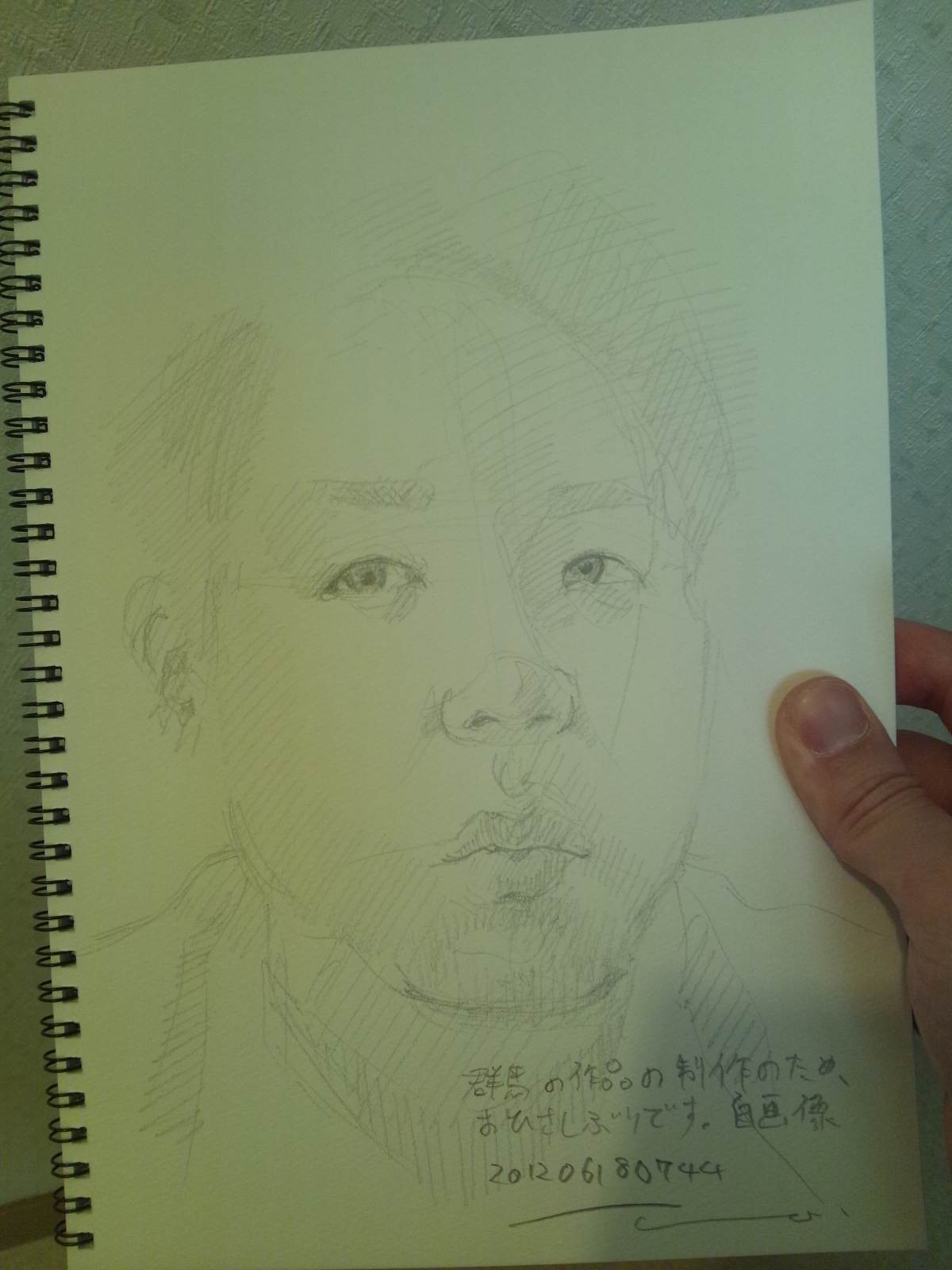 で、3枚目は制作に忙しく(ここだけの話、トイレにパネルを持ち込んでまで制作してましたから)しばらく休んでいた久しぶりの自画像。そこはかとなくやる気もなく適当である。