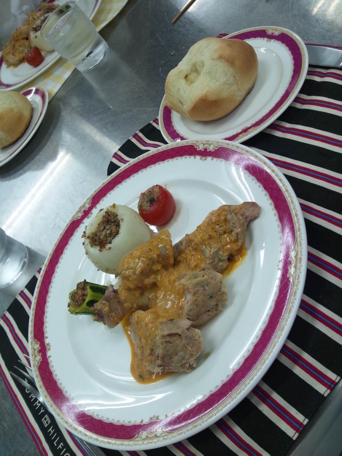 で、画像はおととい月曜日の西洋料理。料理名がよくわからないのだが、鶏もも肉にエビやらひき肉やらエシャロットなどを混ぜたものをつめて、オーブンで焼きあげるという、なんとも手の込んだ感じのする素敵なお料理。ひさしぶりにこれはいいね!と思った。適当に家でも作ってみよう、と言いつつ、料理する暇があったら絵を描きなさい自分、と思う。