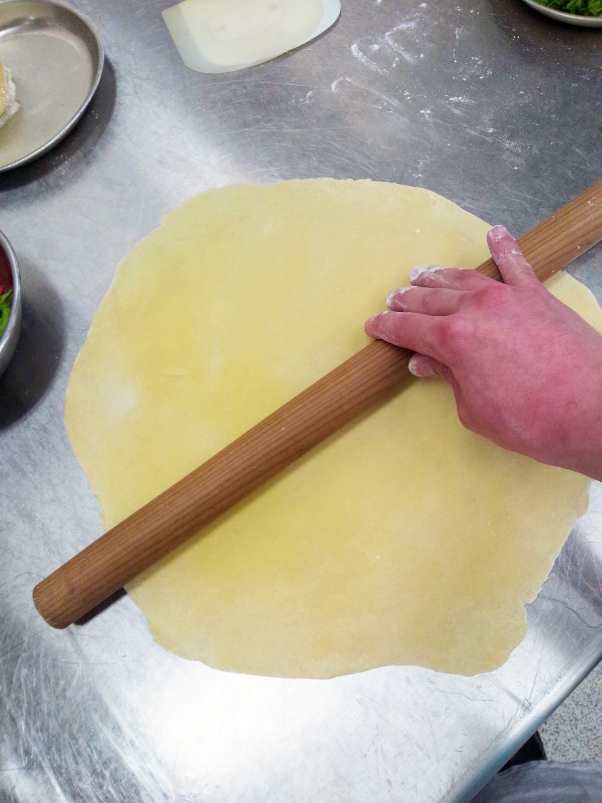 (6)打ち粉をふり、のばし棒で伸ばしていく。横・縦、裏・表と、交互に伸ばし、下が透けて見えるくらいまで伸ばす。