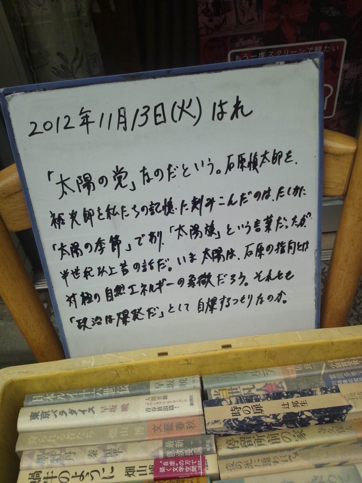 本日の画像の一枚目は神保町のとある古本屋の前に置かれたホワイトボード。雨の日以外は毎日、店主が天気のことや時事問題やおすすめの本やイベント情報や俳句や短歌など何かしらを書いて表に出しているのだ。