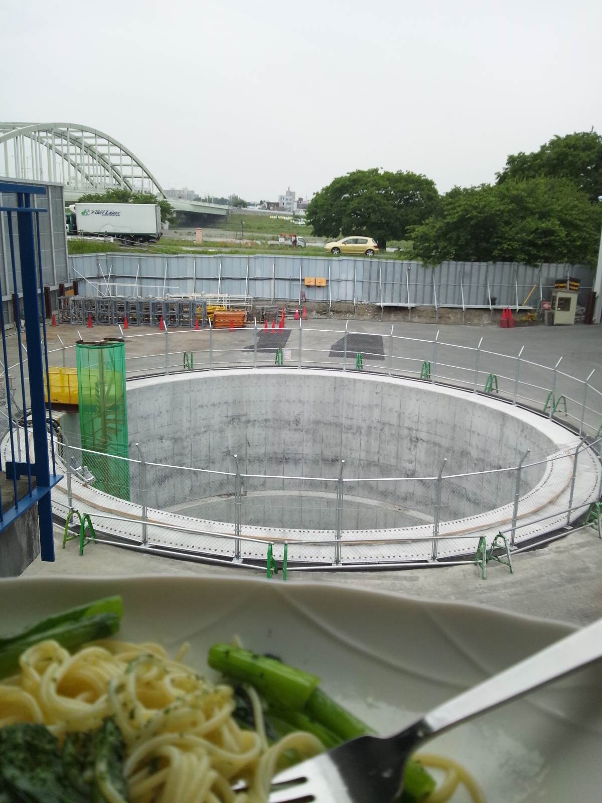 そんな狂気の穴の、奥の平凡な土手ではランニングをしている人、自転車の人、車などが、だらだらだらと流れてゆく。それらを見ながら食べるごはんはめっぽうおいしくて、最近ではひとりいそいそと窓辺に陣取ってごはんを食べるのがマイスタイルの休日の過ごし方のフェイバリットである。ちなみについ最近までこのでっかい穴を取り囲む、高いかこいの壁があって向こうの土手は見えなかったのだが、工事が進んでその壁が取り外されたために、一気に開けたのである。