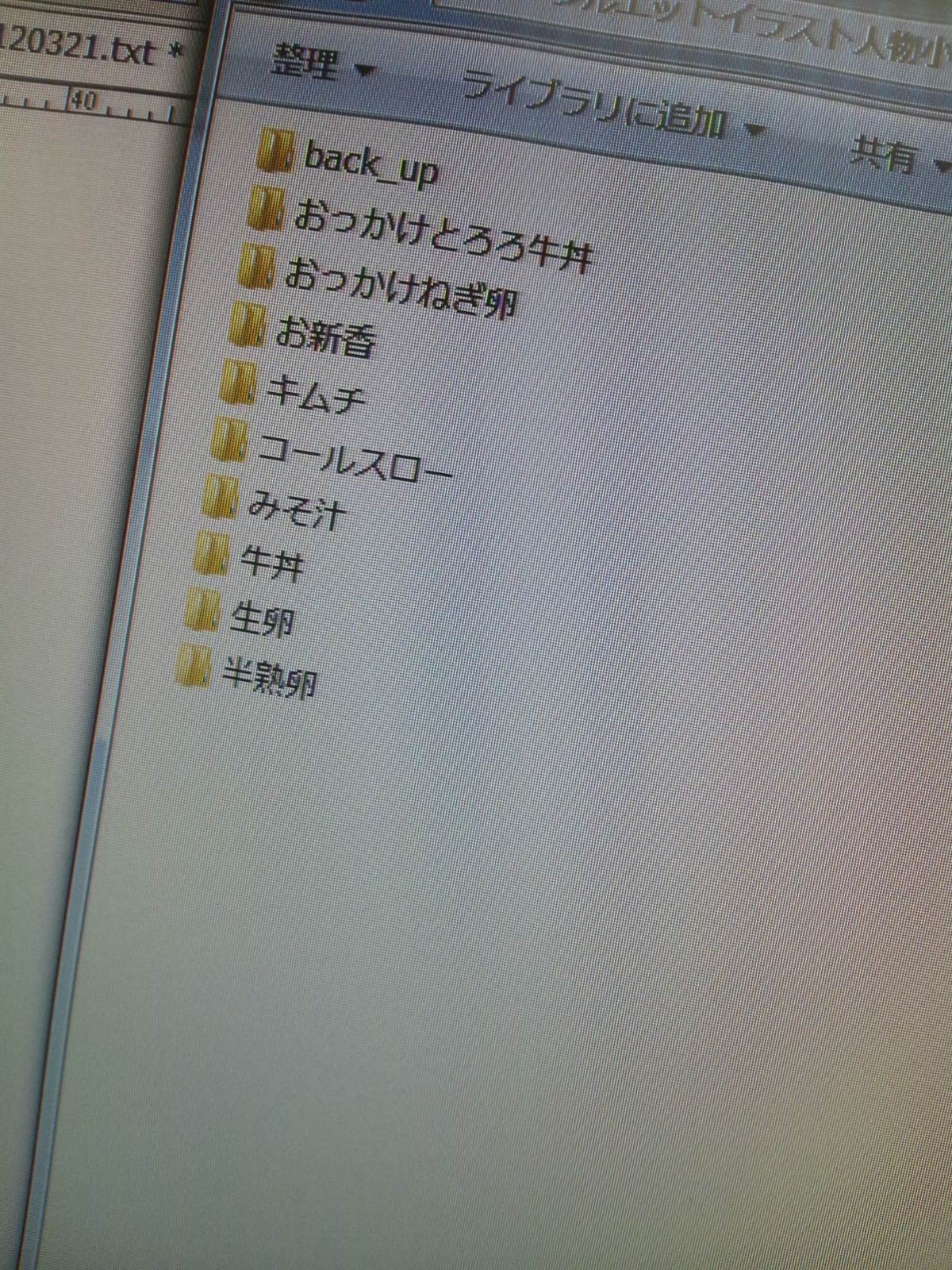 この奇怪な画像はぼくのパソコンのフォルダの様子。きれいにパーツ分けをしようと整理したら、こうなった。もう、シュールすぎる。けど、ひどく気に入っている。この調子で、次はなか卯のうどんあたりを狙うのだ。液体系は絶対的に美しい。