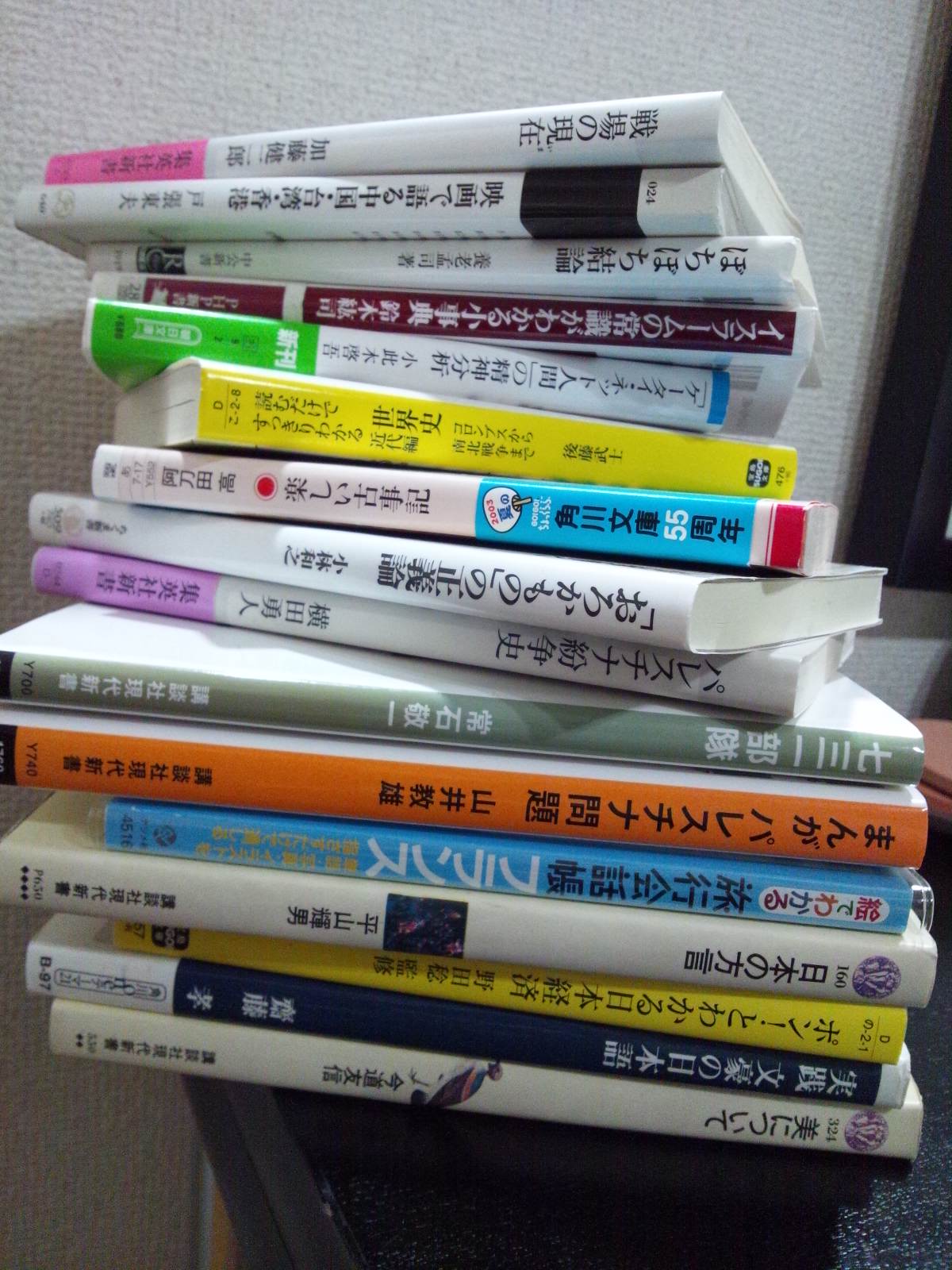 散髪の待ち時間が結構あったので、その間に隣にある古本屋で、画像にある通り山積みの本を買った。いつもぼくはこのように買う。どうだ、インテリっぽくて(あくまで古典的・前時代的な)かっこいいだろう。気の向くまま、でもあくまでも新書ばかりをやたらめったら、とにかくはぼくの中にあるこの世界に対する薄い興味をなるべく伸ばして広げて、いろんなジャンルの本を買うようにしている。で、今回はけっこう戦争関係の本を買ったので、これらは読んだら樋口先生に貸そうかな、とか思う。