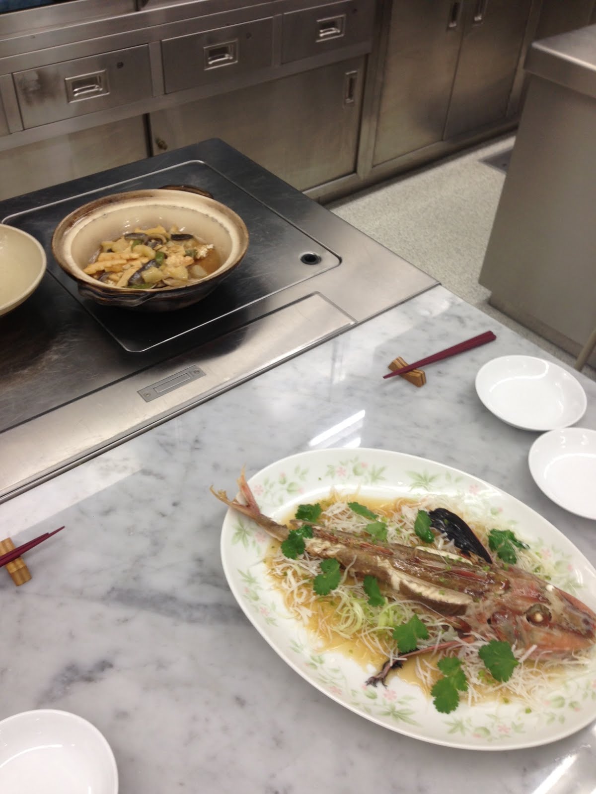 中華料理の最後の授業、の画像。ホウボウとかいう魚を姿のまま蒸した。味はまあまあ。それと、おこげのナマコと豚アキレス腱のあんかけ、が奥のやつ。