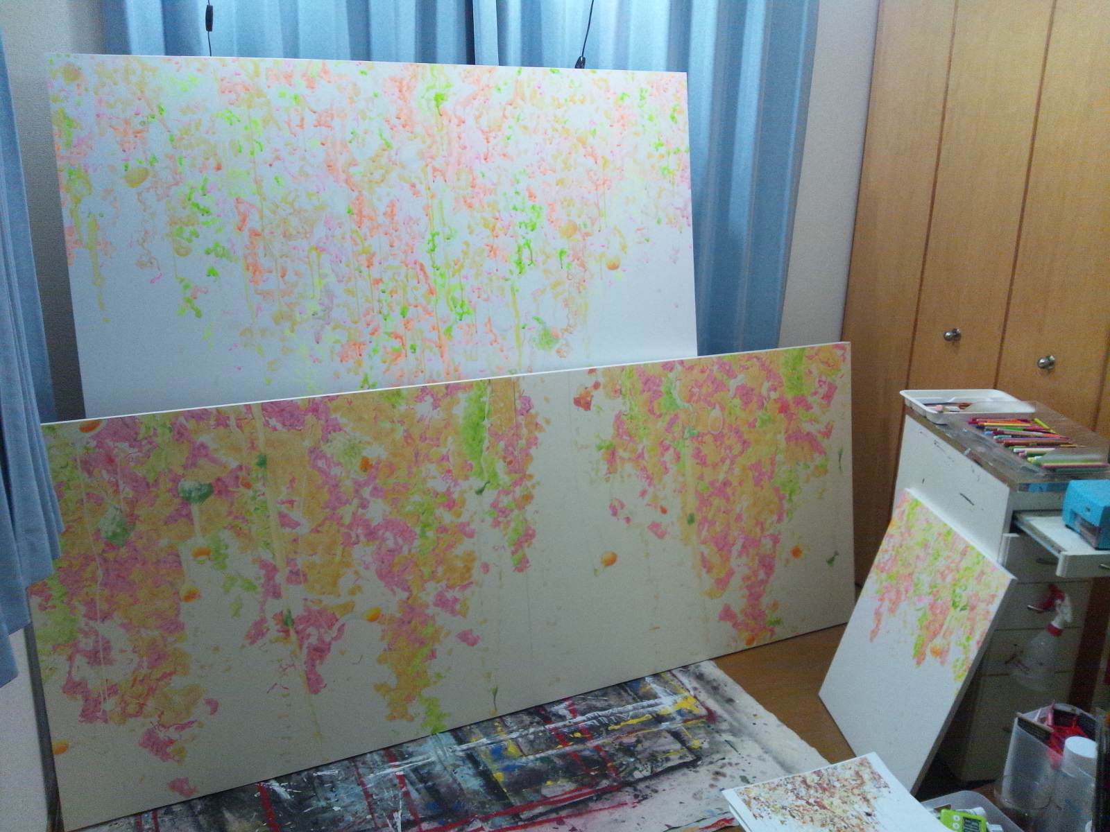 画像はひさびさに樋口氏と飲み明かしまして、酔っ払いながらも至極真剣大真面目にぼくの絵の批評会を二人で行っているところでございます。