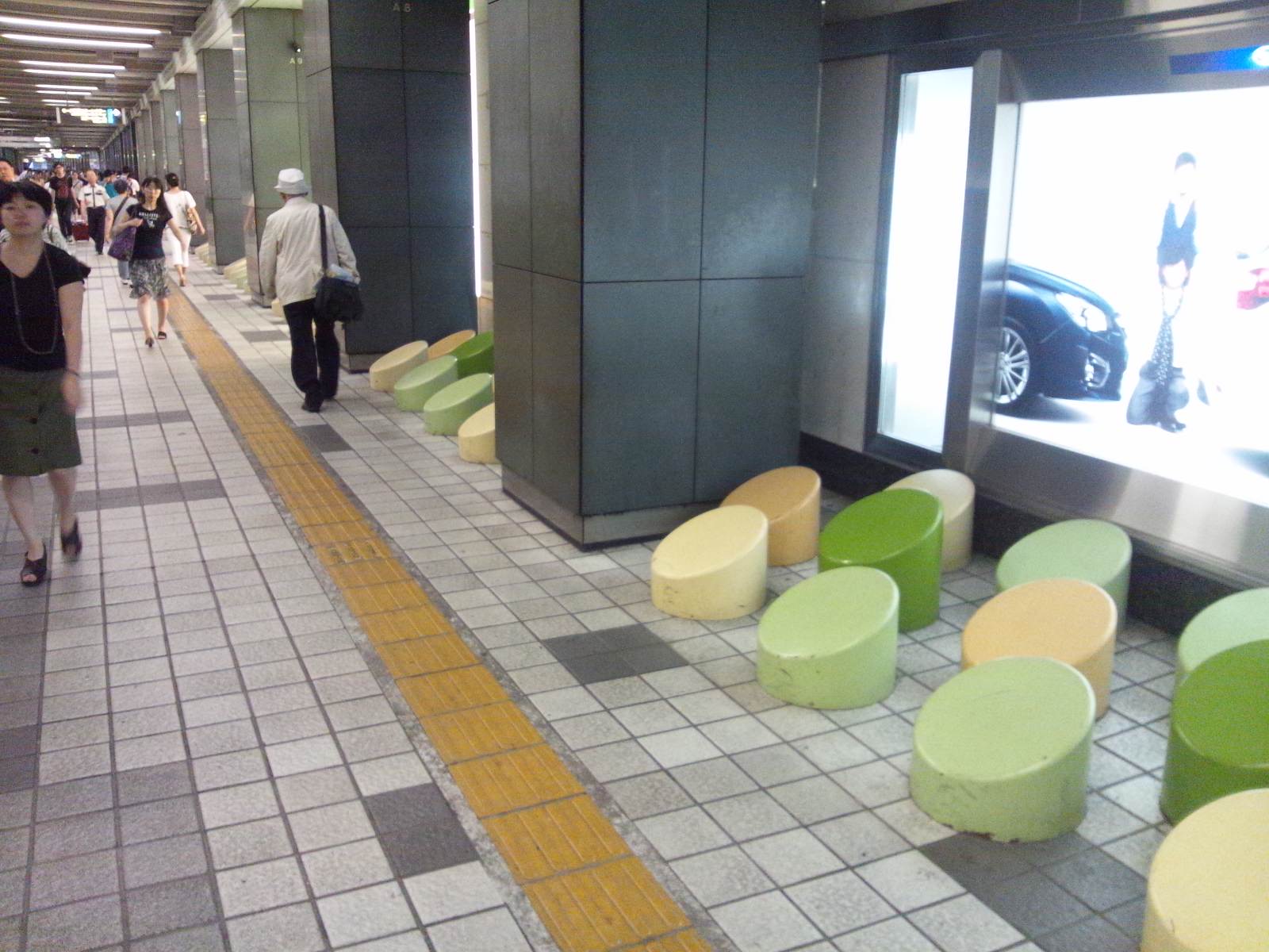 その動く歩道と一緒に設置されたのがこのオブジェ群、否、「ホームレスよけ」である。名目上は景観のためとされているそうだが、このような物体を設置することによって、段ボールハウスが建てられるのを防いでいるのである。