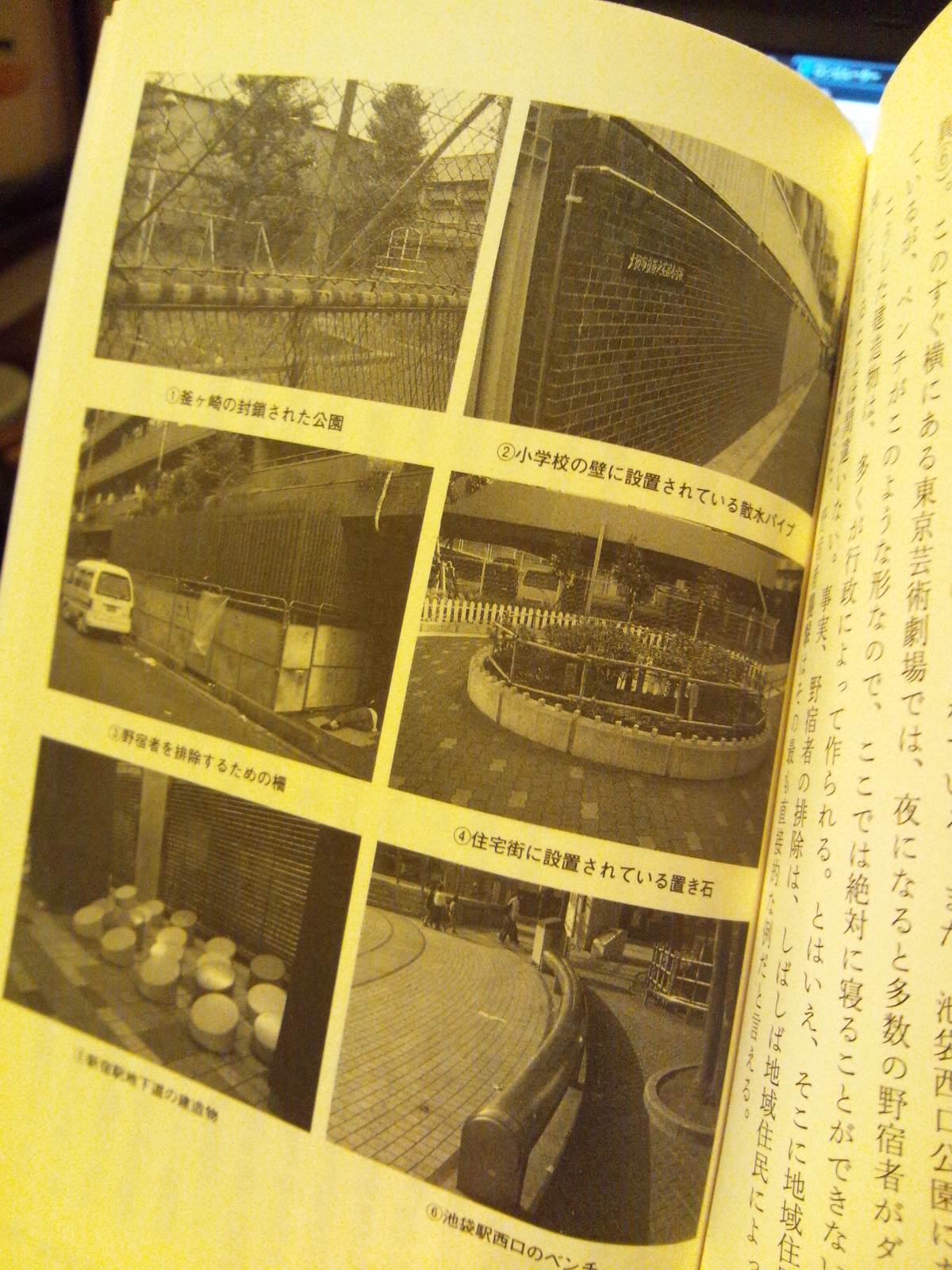 金網を張り巡らし施錠された公園は人の立ち入りを拒み、不自然な突起物が設けられた植え込みの縁は座ることを拒み、丸太状になったベンチは寝ころぶことを拒み、極めつけは小学校の塀に設けられた散水パイプで、毎朝定時に散水が始まるためそこで寝泊りするような輩を完全に拒否している。