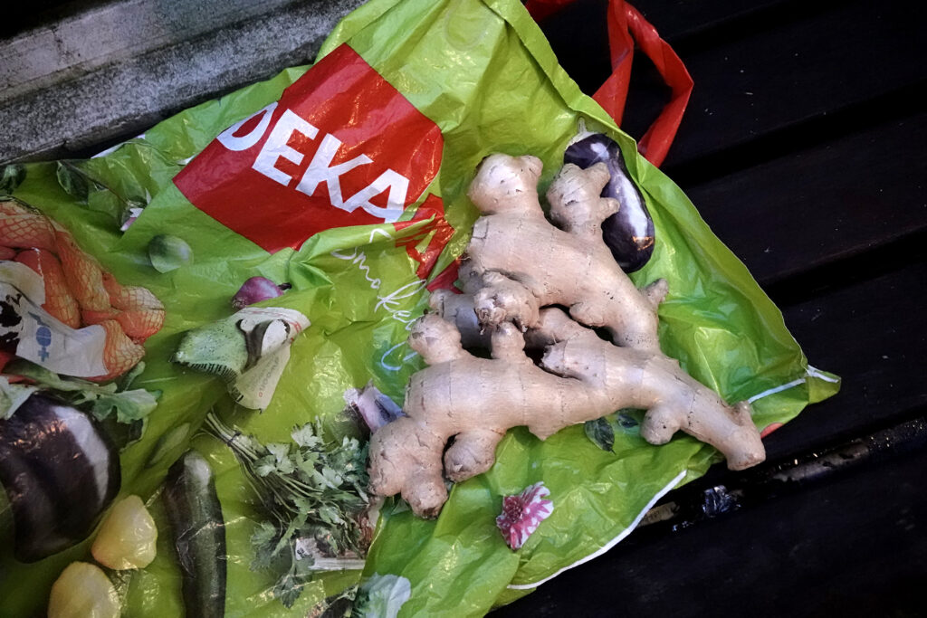 I have been drinking ginger tea every morning. I found that the ginger at the farmers market is tastier than the one at the supermarket. In the evening, around 4:30 pm, I went to the farmers market. My favorite vegetable shop was about to close, but I was able to get a big piece of ginger. It was only €2. I stopped by a second hand shop and bought an egg plate and a small shot glass. At the cashier, Oki was working. He is a regular customer at the bar My Way. The total cost was only €1. I visited the bar My Way. It was in a good mood. I cooked spaghetti with an electric hot pot in my room because I wanted to check whether it was possible to cook spaghetti without a pan. It was quite tasty. I was drunk, and I fell asleep around 10:30 pm.