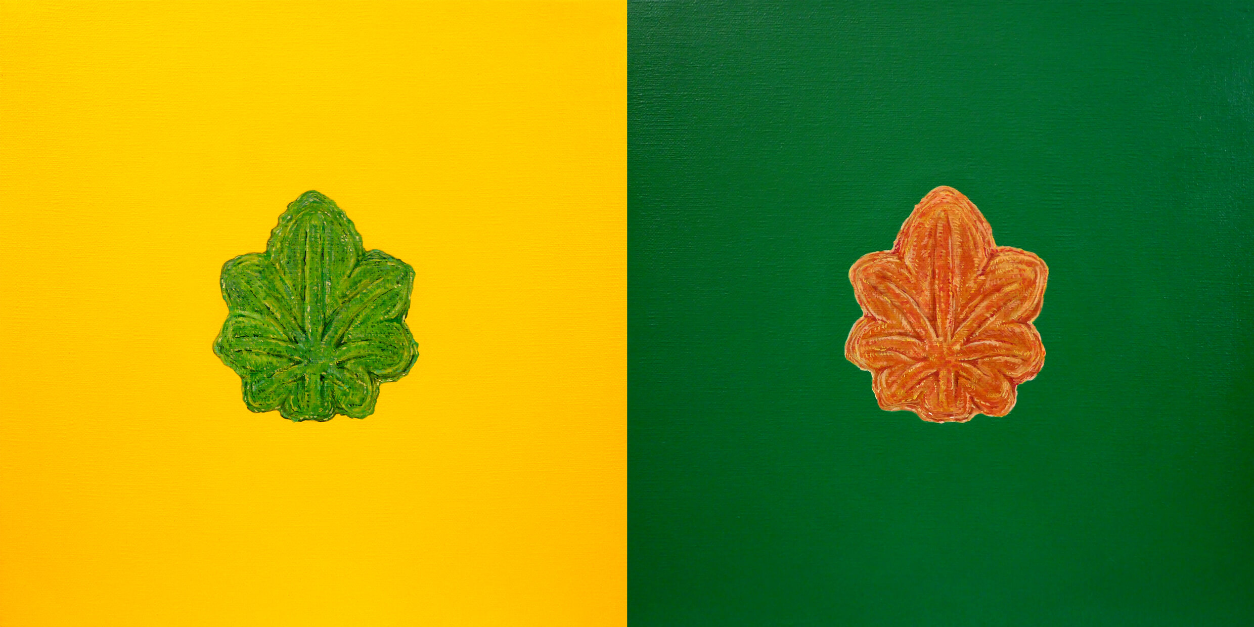 本シリーズは、グローバリズムの終焉とともに閉じてゆく世界を風刺するものである。そのモチーフとして、外国人に大麻をかたどったと勘違いされることもある広島名物「もみじまんじゅう」を用いる。これを各国の国旗から引用した色面に配置し、単なるまんじゅうが場所や文脈によって異なる解釈がなされることを表す。また、緑に着色した方はまんじゅう自体に大麻を含ませ、もう一方は大麻を混ぜた絵の具で描画する。つまり、片方はあくまで絵画上の大麻のイメージ、もう一方は大麻という物質そのものとする。これを並置することで、絵画というフィクションと現実とを対比させると同時に、芸術に法律を、法律に芸術をからみつかせ、「たかが」芸術では終わらない不安定な状態を作り出す。私は本作を大麻が合法となっている米国カリフォルニア州において制作するが、当然これを持ち込めない国も出てくる。それは、我々がかつて信仰したグローバリズムが幻想であったことを雄弁に物語るのではないだろうか。