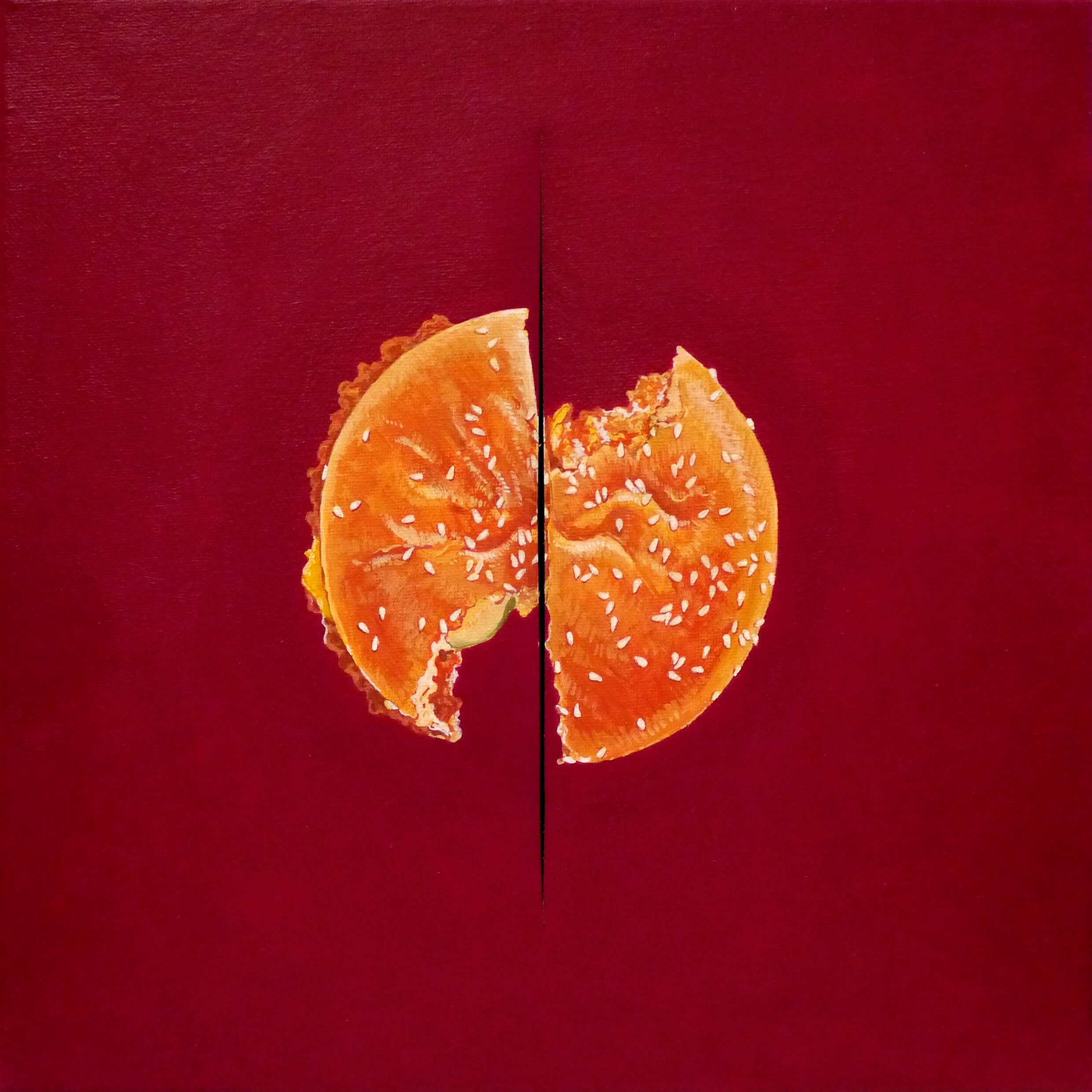 私はこの状況を具現化してみせたい。前作と異なるのは、ハンバーガーを半分に切り分け、それを一口ずつ食べる点だ。これは未知の感染症により分断された人間関係を象徴すると同時に、互いの感染リスクを下げるための人道的な配慮でもある。次に、その二つに分かれたハンバーガーを、絵画上で切断面を合わせ、イメージとして修復する。終息に向け一致団結を求める為政者や専門家の虚しい呼びかけ、そのメタファーである。最後に完成した作品に切り込みを入れ、物理的に再び分断する。どう取り繕っても、完全に引き裂かれているのが現実だ。
