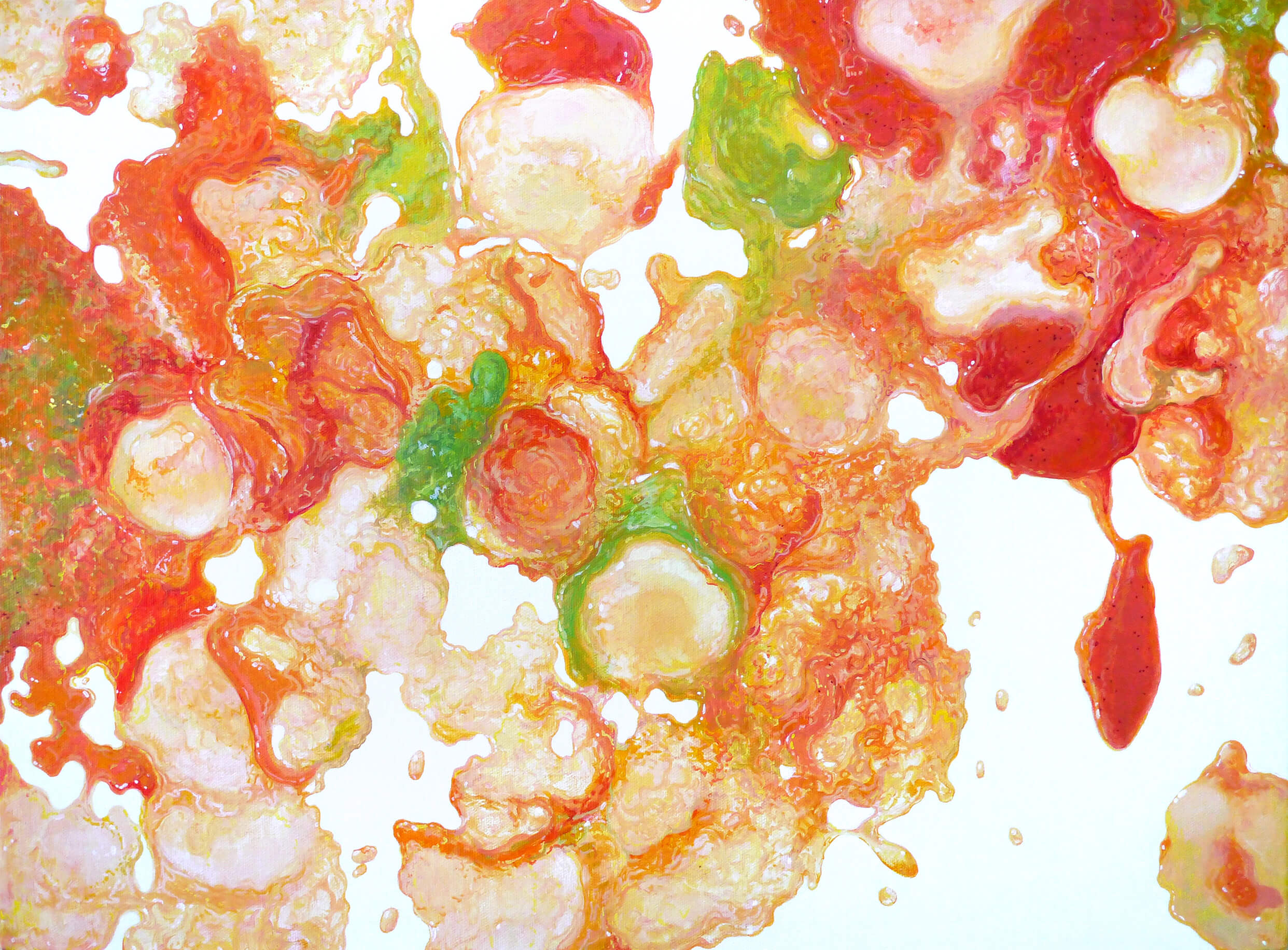 本シリーズは、流動食に内包されている両義性をあぶり出そうとする試みである。流動食を、打ち水のようにぶちまけたり、ストライプやドットといった規則的なパターンとして配置したりする。それは、何かを調べる際の基本である、切る・砕くといった分析解剖の態度である。そこには自ずと、生と死とが交互に、あるいは混交して、消えつ浮かびつするのである。